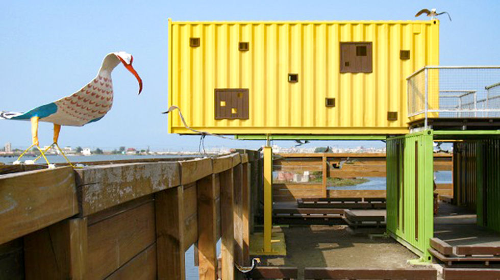 配合成龍濕地賞鳥與教育活動之需求,本設計在費用受限的條件下,利用舊貨櫃疊架出適合當地的賞鳥空間,色彩上融合當地大環境色調,使賞鳥屋能夠不對視覺與生態造成衝擊;透過不同尺寸與高度的賞景窗設計,創造一個通風、日照充足、且適合不同年齡層使用的通用環境;而高架平台的設計,能夠對應漲退潮展現乾景與水景兩種景致,凸顯當地的環境特色。